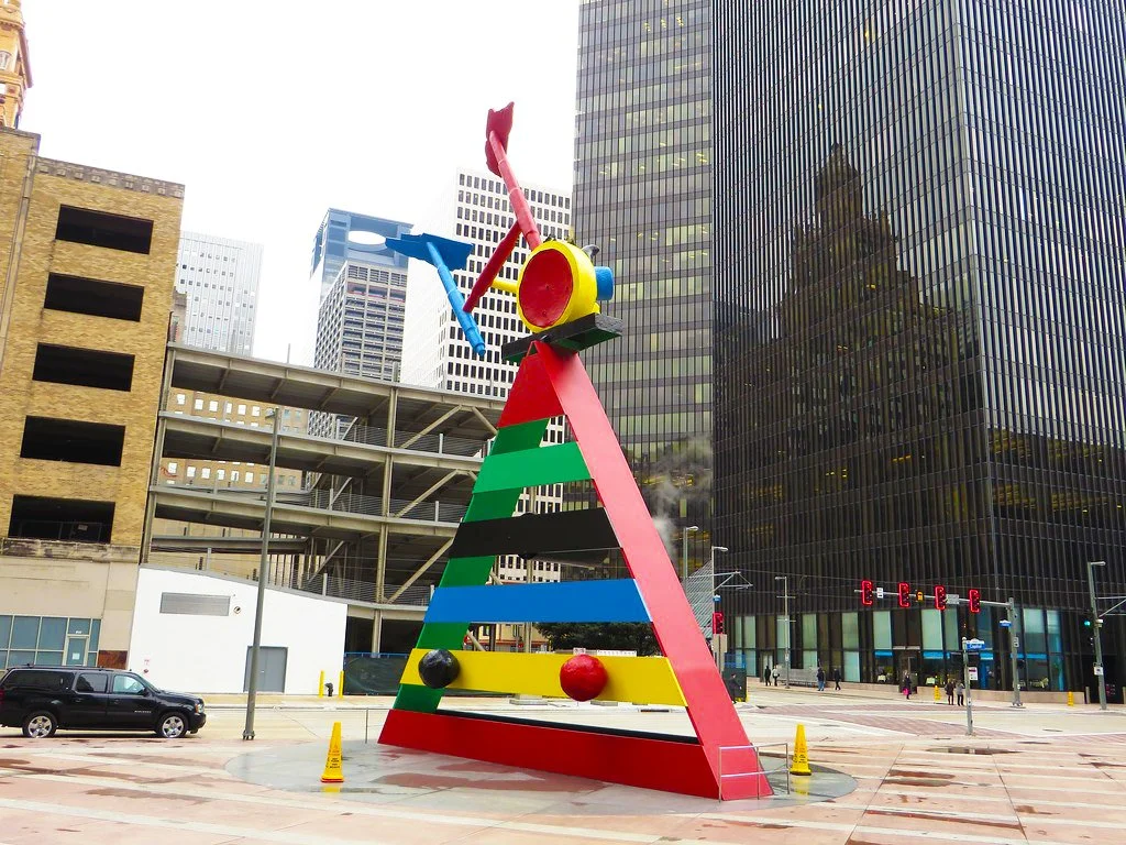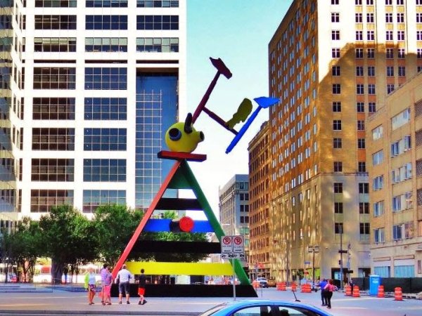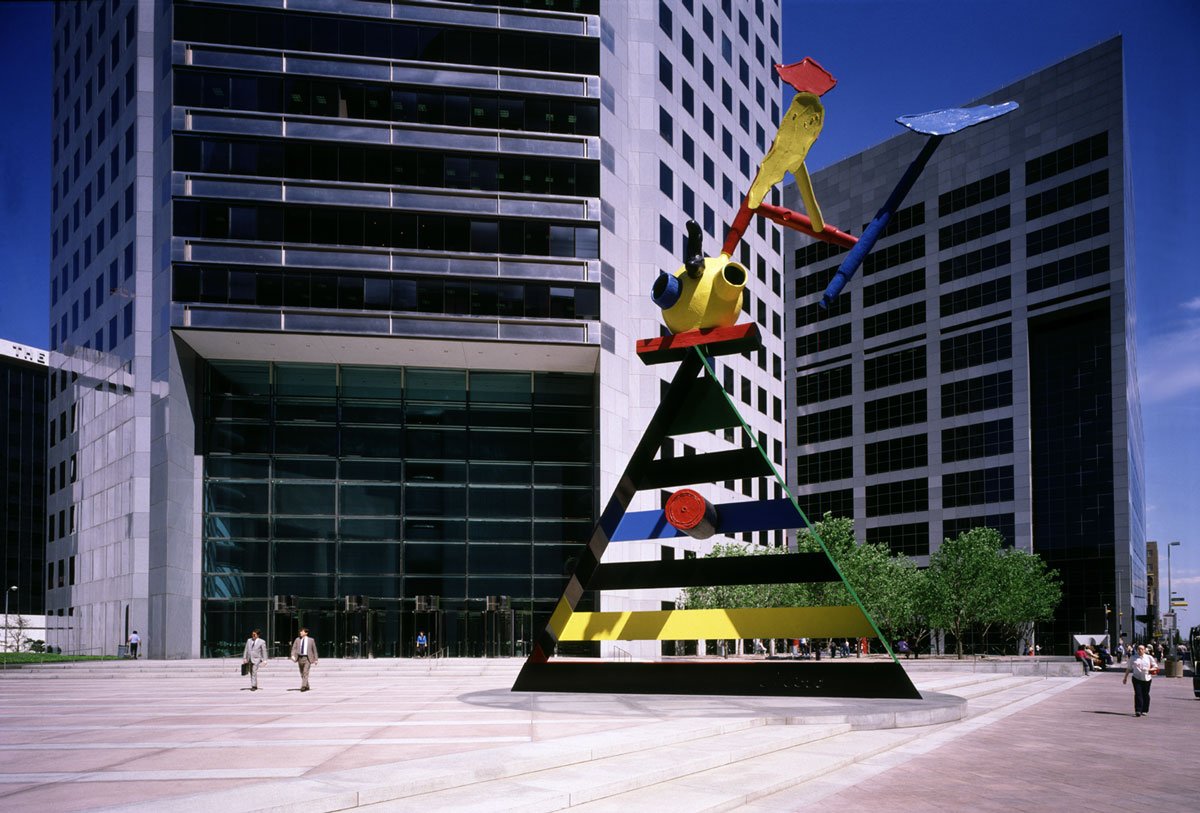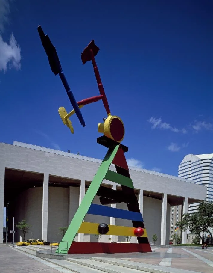 Joan Miró’s Personage and Birds dominates downtown Houston’s JPMorgan Chase Tower plaza like a colorful guard standing watch. The steel and cast-bronze sculpture is a representation of a person with birds in flight around the head. The body is a triangle made up of wide bands of metal painted in bright green, red, blue and yellow. A circle of red and yellow metal sits atop the “shoulders,” with three abstract shapes circling. The piece is the largest Miró ever commissioned (it is 35 feet wide at its base and stands 55 feet tall), but despite the colossal size, it seems lightweight, as if it could start walking across the plaza at any moment. The piece, chosen by the building’s architect, I.M. Pei, was installed to mark Miró’s 89th birthday in April of 1982