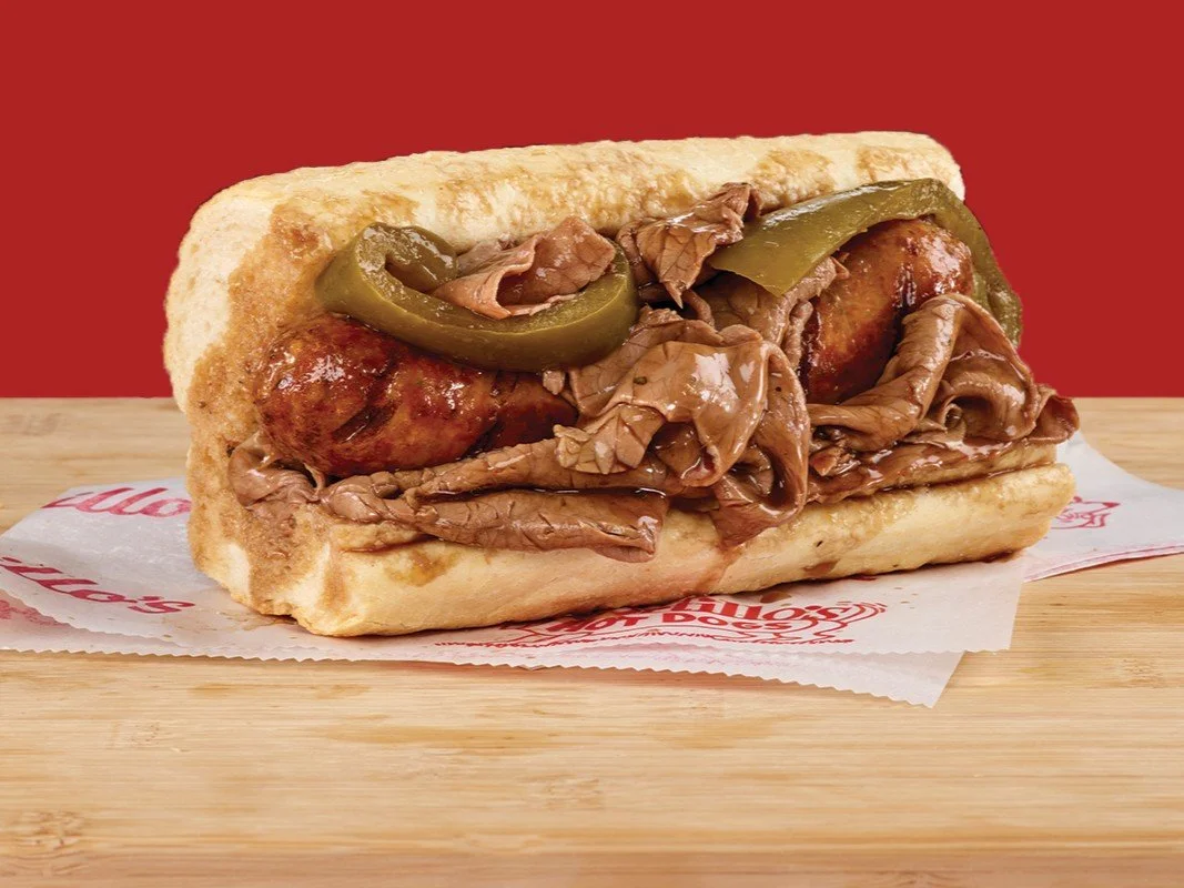 We’re known for our famous Chicago-style hot dogs, Italian beef sandwiches, chopped salad, cheese fries, homemade chocolate cake, and chocolate cake shake. Our Italian beef is slow-roasted for four hours, thinly sliced, and served on freshly baked French bread. Then, it’s dipped in hot gravy made with our homemade blend of seasonings that we’ve been perfecting for 50 years. Haven’t tried Portillo’s yet? Order an Italian beef, dipped with sweet or hot peppers (add mozzarella if you’re feeling cheesy), or a Chicago-style hot dog “dragged through the garden” and you’ll see what all the hype is about.
