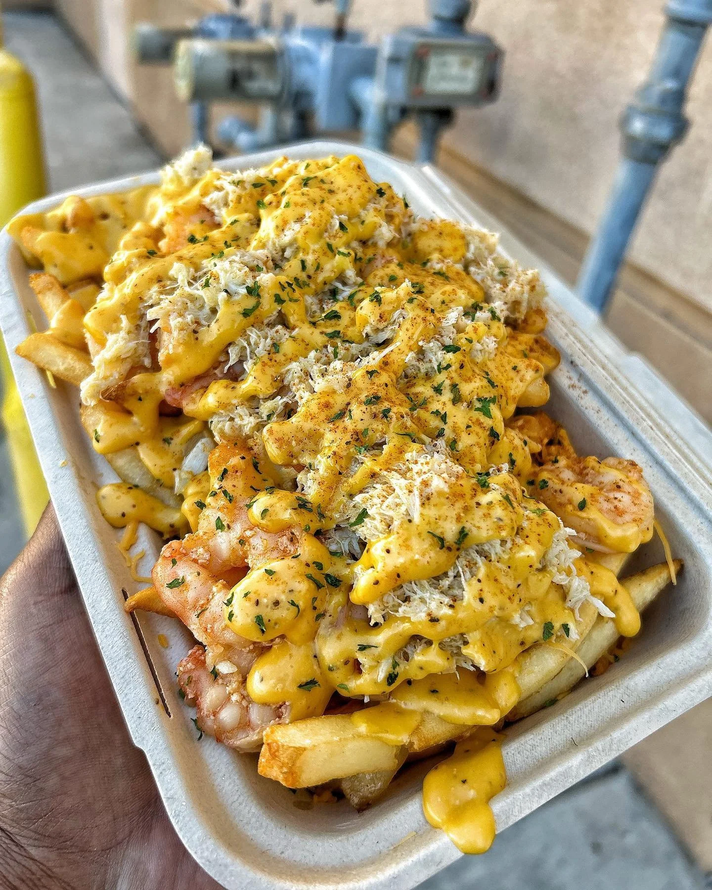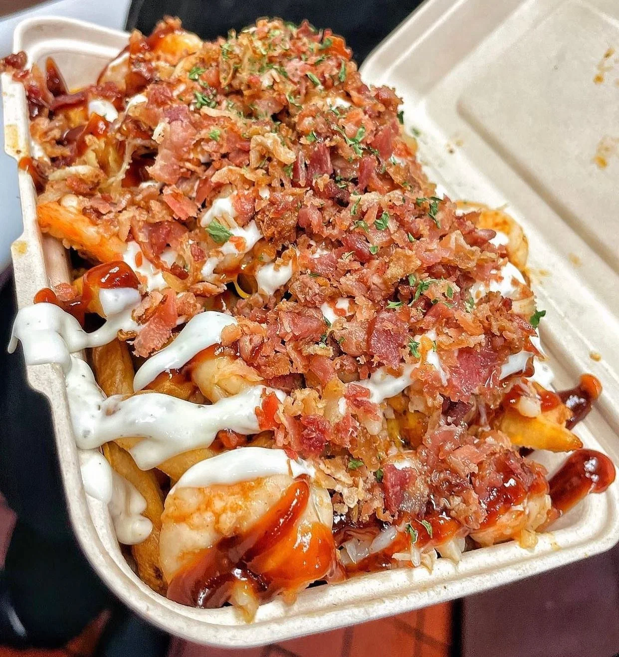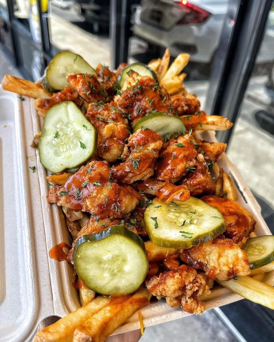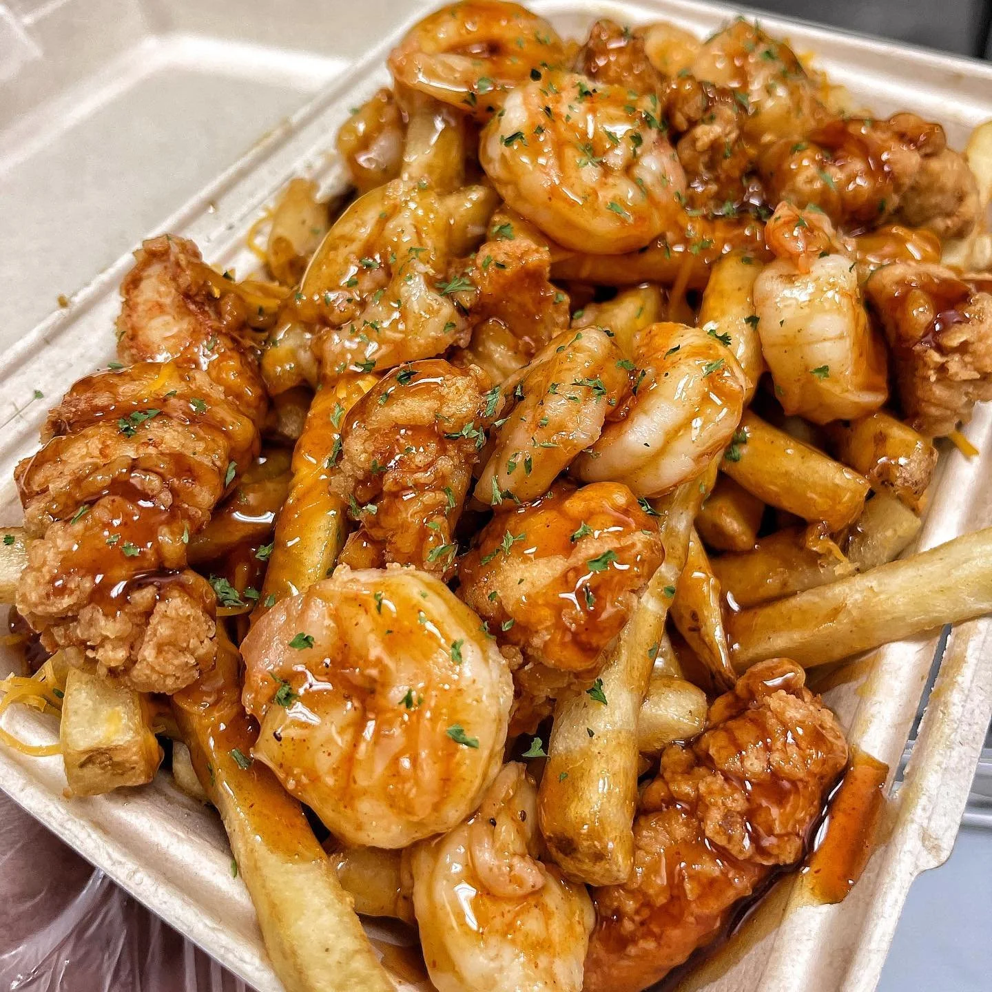 Mr. Fries Man’s menu features imaginative toppings on fries, such as jerk chicken, shrimp, and vegan options. The restaurant has received positive reviews for its unique offerings and quality of food.