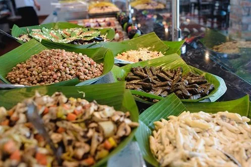 Aladdin offers a great variety of Mediterranean salads, spreads, vegetable dishes, sandwiches, shawerma, shish kabob and more, and the best fresh baked pita in town. Vegan-friendly.