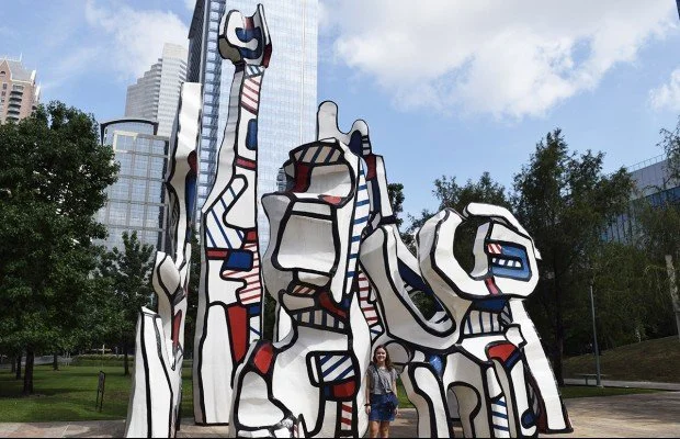 It is by Jean Dubuffet, an internationally-known 20th century French sculptor who passed away in 1985 (two years after the sculpture was completed). He liked to communicate fresh ideas without reference to “cultural clichés.” Dubuffet was inspired by the art of outsiders, which he called “L’Art Brut”. It is painted fiberglass over steel frames, and the tallest piece is 33 feet. The sculpture is part of his Hourloupe series, which has companion sculptures in New York, Chicago and Europe. For more than two decades, Jean Dubuffet’s sculpture, Monument au Fantôme, has sat among Houston’s downtown skyscrapers at 1100 Louisiana. In 2008 it was relocated to 1500 McKinney (Avenue de las Americas) in Discovery Green Park on the eastern edge of downtown. The tallest part of the fiberglass over steel frame stands 33 feet tall. Seven individual forms—chimney, church, dog, hedge, mast, phantom, and tree—included in the sculpture represent features of Houston.