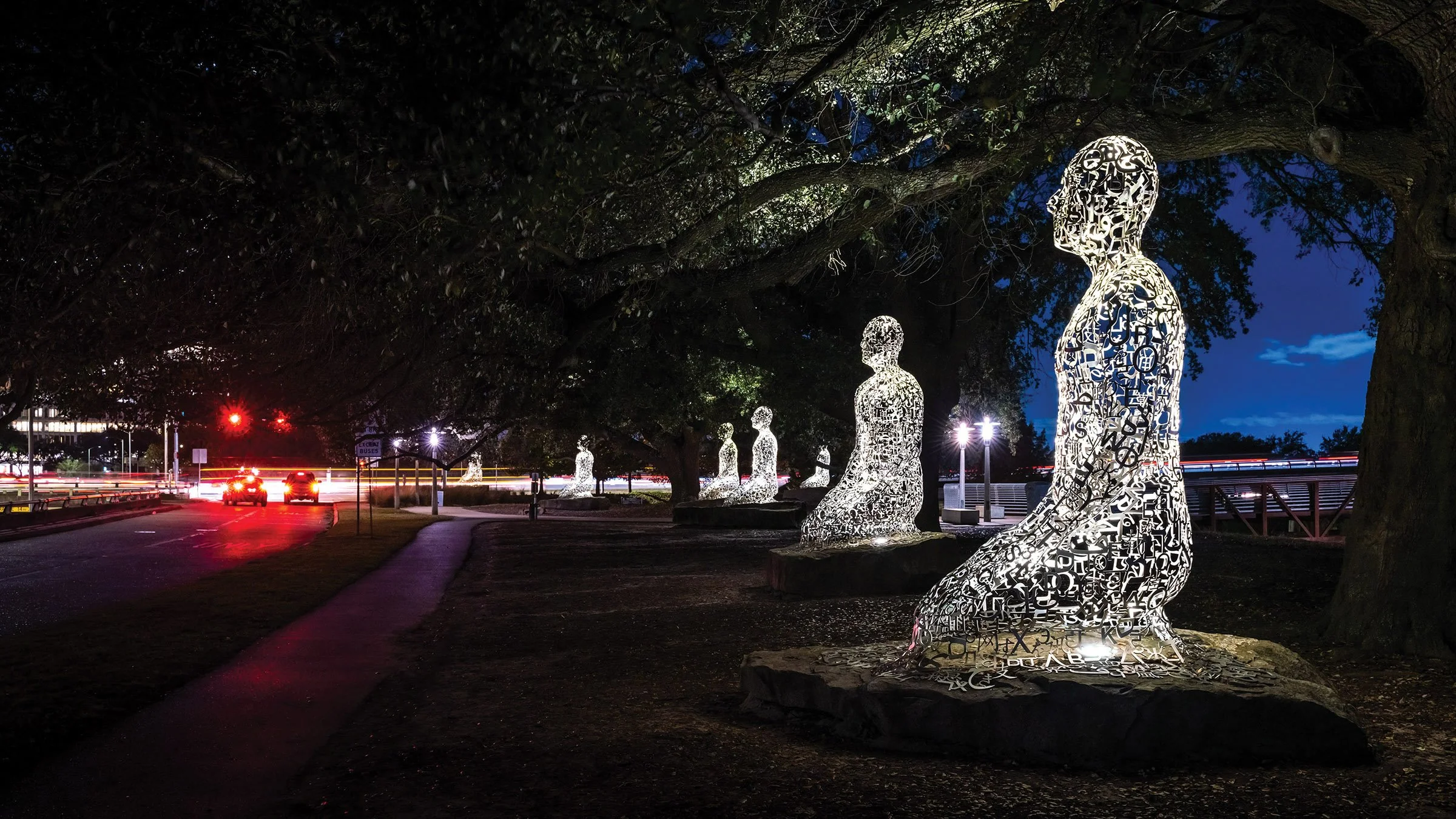 Created by internationally renowned Spanish sculptor Jaume Plensa, Tolerance comprises a grouping of seven sculptures sited in Buffalo Bayou Park at the intersection of Allen Parkway and Montrose Boulevard. The grouping was installed in 2011 to coincide with the construction of the Rosemont Bridge, which offers pedestrians and bicyclists a place to cross Buffalo Bayou safely. The seven human figures represent the seven continents. Each embodies the need for tolerance, openness, and understanding towards others’ cultures, social structures, values, and faiths, qualities essential among people existing in an interdependent world. The framework of each sculpture consists of alphabetic symbols from nine different languages around the world, reflecting Plensa’s belief that no matter the language we think in, our lives are similar. The seven sculptures rest on seven rough-cut granite pedestals, lit from within.